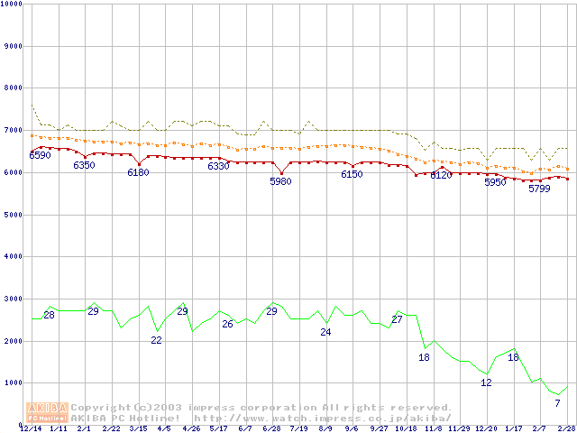 Socket 478 (micro-PGA,FSB 400MHz,L2 128KB,Willamette)の最安値推移