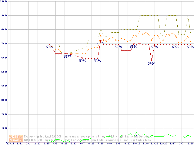 PC2700(DDR333) DDR SDRAM DIMM ECC対応 Registeredタイプの最安値推移