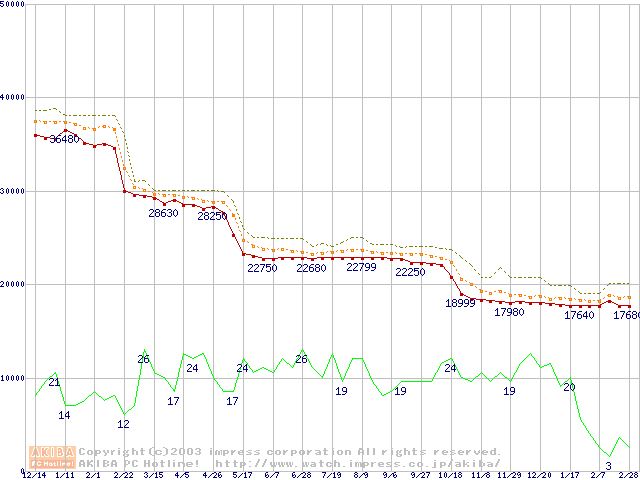 Socket 478 (micro-PGA,FSB 533MHz,L2 512KB,Northwood)の最安値推移