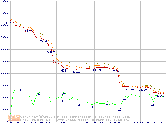 Socket 478 (micro-PGA,FSB 533MHz,L2 512KB,Hyper-Threading,Northwood)の最安値推移