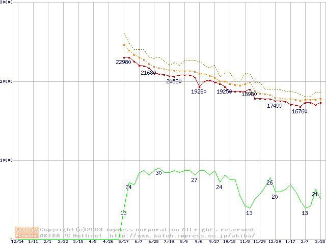 Socket 478 (micro-PGA,FSB 800MHz,L2 512KB,Hyper-Threading,Northwood)の最安値推移