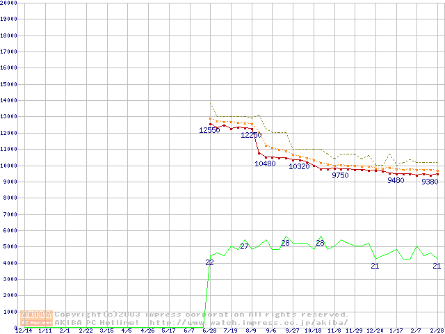 Socket 478 (micro-PGA,FSB 400MHz,L2 128KB,Northwood)の最安値推移