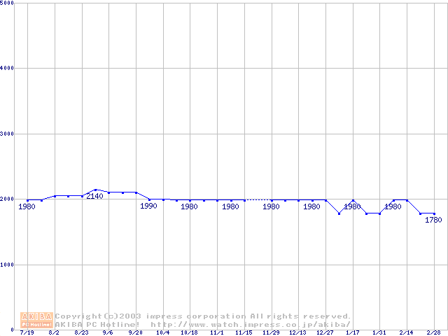 | [↑前グラフ]: | Socket A (OPGA,FSB 266MHz,L2 64KB,Applebred)の最安値推移 |