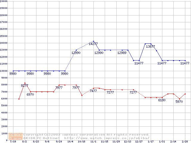 | [↓次グラフ]: | PC2700(DDR333) DDR SDRAM DIMM ECC対応 Registeredタイプの最安値推移 |