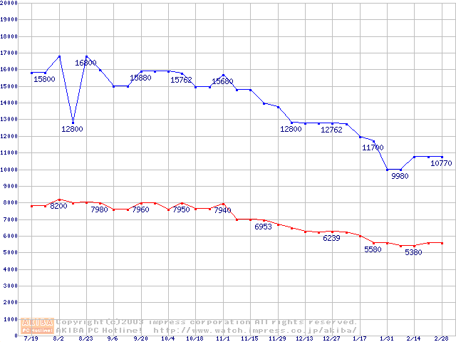 | [↓次グラフ]: | PC4300(DDR533) DDR SDRAM DIMMの最安値推移 |