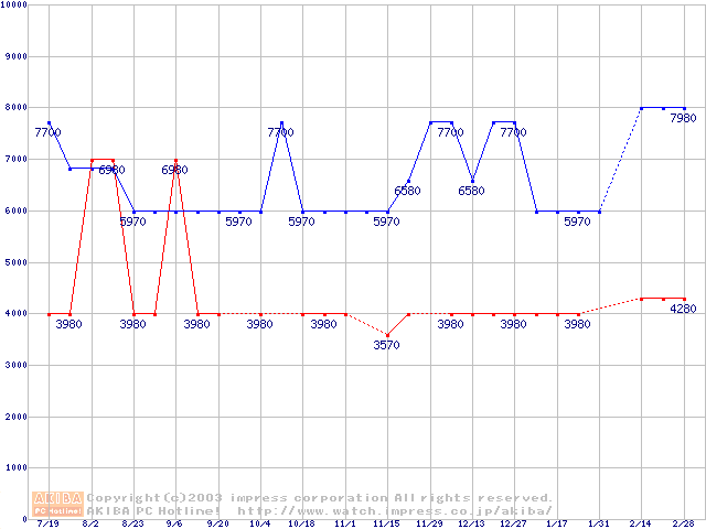 | [↑前グラフ]: | PC133 SDRAM DIMM CasLatency=2の最安値推移 |