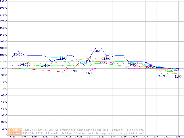| [↓次グラフ]: | 2.5インチHDD主要製品(最安値1万円~1万5千円未満)の最安値推移 |