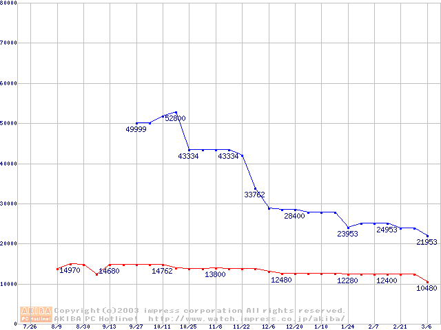 メモリ主要製品(最安値1万円以上)の最安値推移