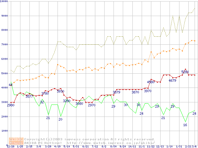 PC100 SDRAM DIMM CasLatency=2の最安値推移