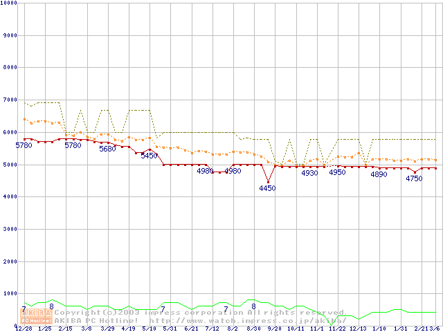 Socket A (PGA,FSB 266MHz,L2 256KB,Thunderbird)の最安値推移