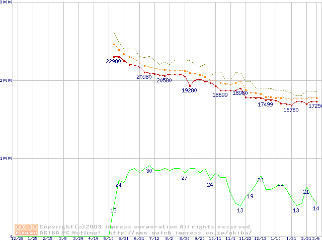 Socket 478 (micro-PGA,FSB 800MHz,L2 512KB,Hyper-Threading,Northwood)の最安値推移