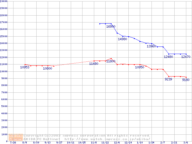 | [↑前グラフ]: | Momentusシリーズ (9.5mm,5400rpm,UltraATA/100,8MB,FDB)の最安値推移 |