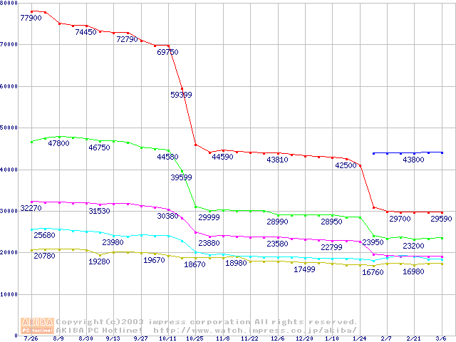 | [↓次グラフ]: | Socket 478 (micro-PGA,FSB 533MHz,L2 512KB,Hyper-Threading,Northwood)の最安値推移 |