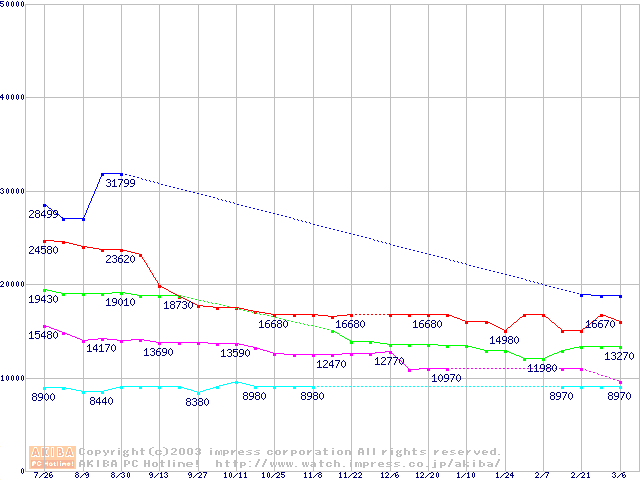 | [↓次グラフ]: | WD Caviar (7200rpm,UltraATA/100,20GB/Platter)の最安値推移 |