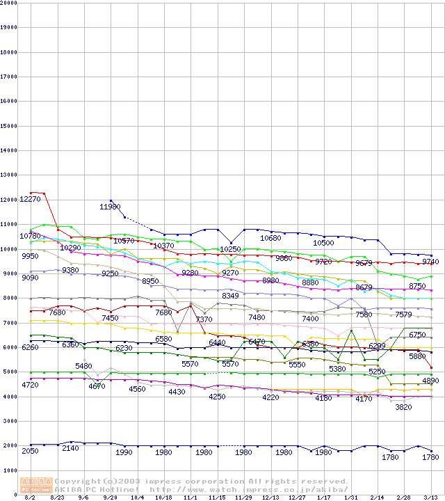 CPU主要製品(最安値1万円~2万円未満)の最安値推移