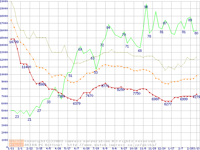 PC3200(DDR400) DDR SDRAM DIMMの最安値推移