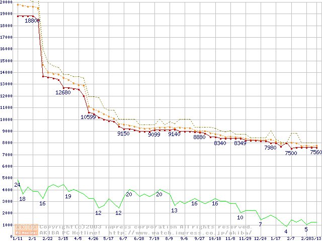 Socket A (OPGA,FSB 266MHz,L2 256KB,Thoroughbred)の最安値推移