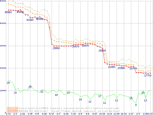 Socket 478 (micro-PGA,FSB 533MHz,L2 512KB,Northwood)の最安値推移