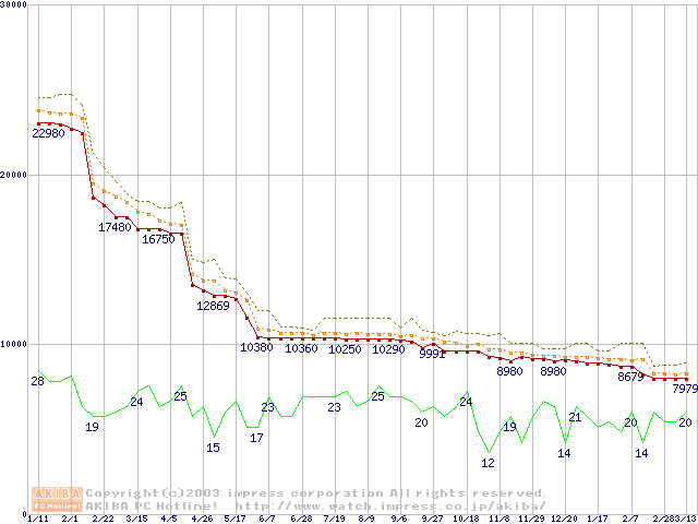 Socket A (OPGA,FSB 266MHz,L2 256KB,Thoroughbred)の最安値推移