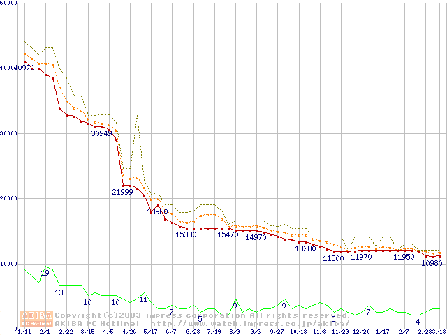 Socket A (OPGA,FSB 333MHz,L2 256KB,Thoroughbred)の最安値推移