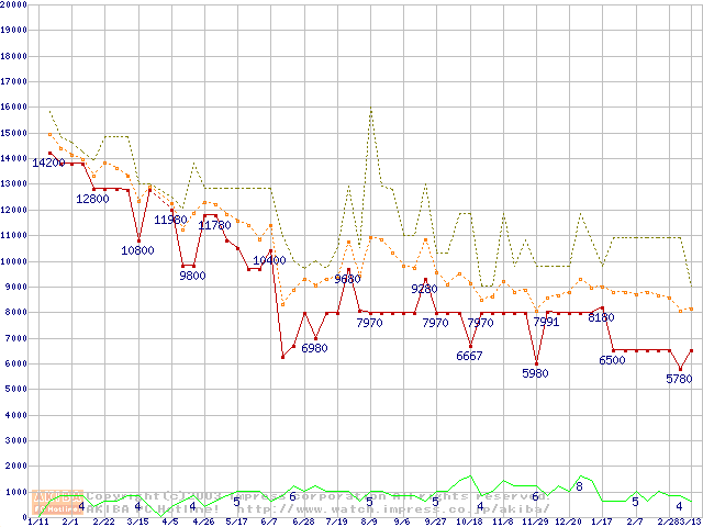 PC3500(DDR433) DDR SDRAM DIMMの最安値推移