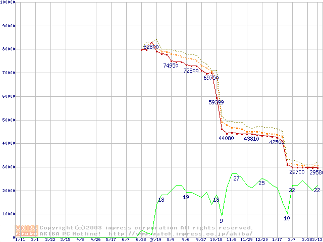Socket 478 (micro-PGA,FSB 800MHz,L2 512KB,Hyper-Threading,Northwood)の最安値推移