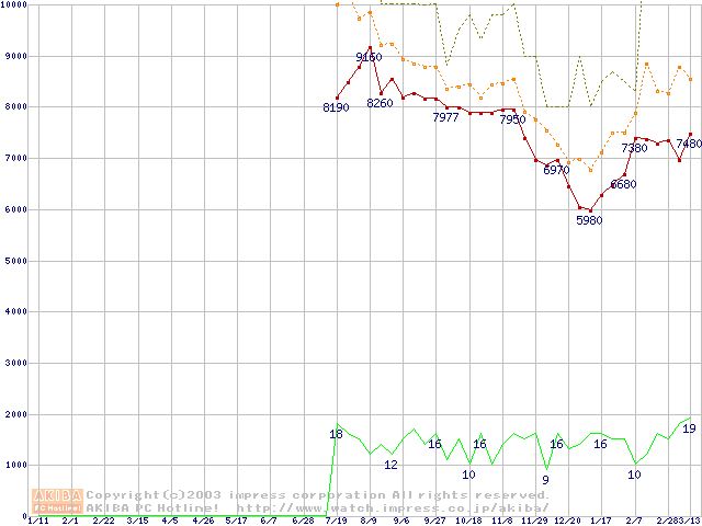 PC3200(DDR400) DDR SDRAM DIMMの最安値推移