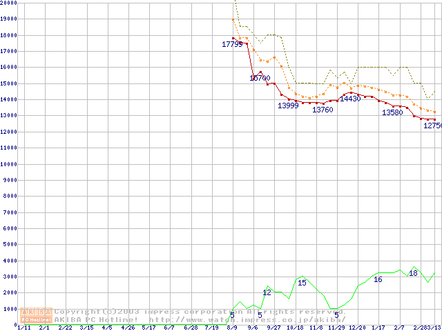 Travelstar 5K80 (9.5mm,5400rpm,UltraATA/100,8MB,FDB,40GB/Platter)の最安値推移