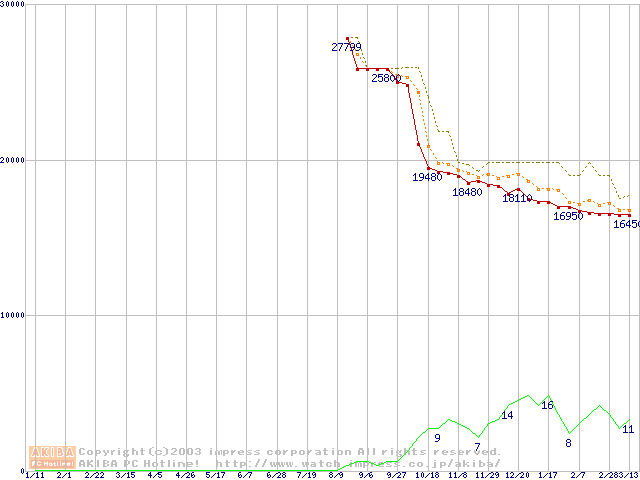 Travelstar 5K80 (9.5mm,5400rpm,UltraATA/100,8MB,FDB,40GB/Platter)の最安値推移