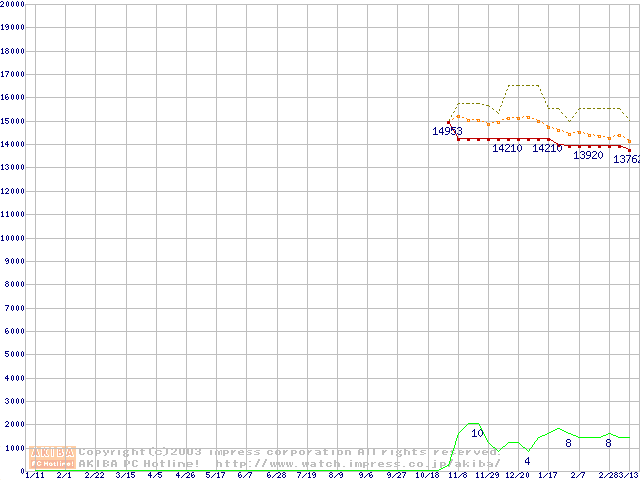 2.5インチHDD主要製品(最安値1万円~1万5千円未満)の最安値推移