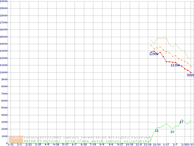 Travelstar 5K80 (9.5mm,5400rpm,UltraATA/100,8MB,FDB,40GB/Platter)の最安値推移