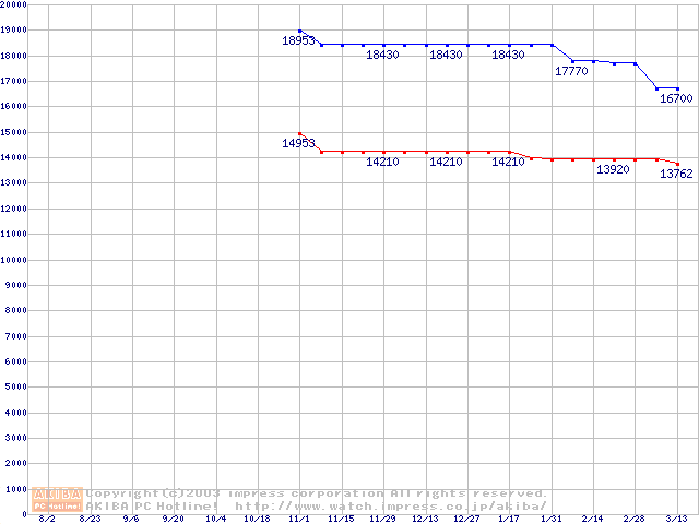 | [↑前グラフ]: | MKシリーズ (9.5mm,4200rpm,2MB,FDB,30GB/Platter)の最安値推移 |