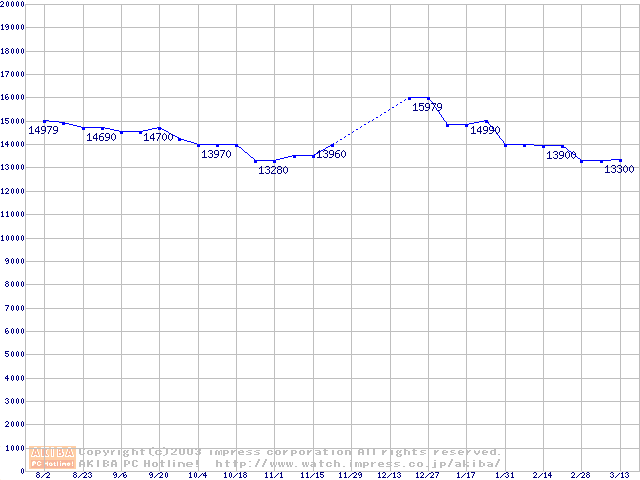 | [↑前グラフ]: | Travelstar 5K80 (9.5mm,5400rpm,UltraATA/100,8MB,FDB,40GB/Platter)の最安値推移 |