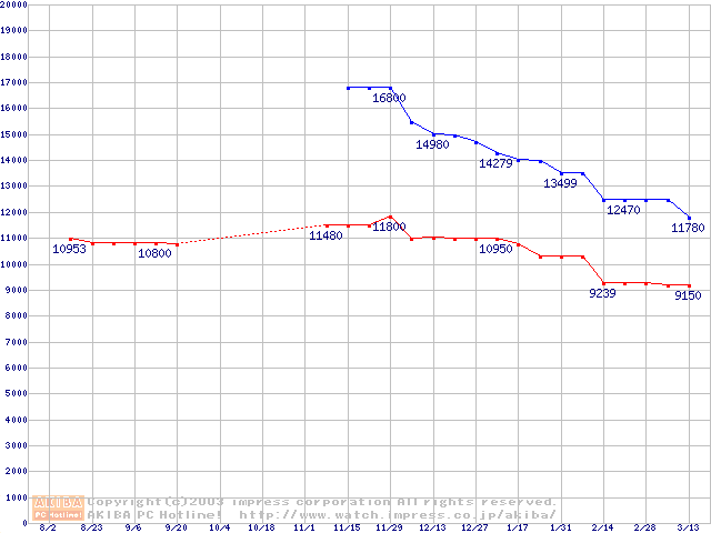 | [↑前グラフ]: | Momentusシリーズ (9.5mm,5400rpm,UltraATA/100,8MB,FDB)の最安値推移 |