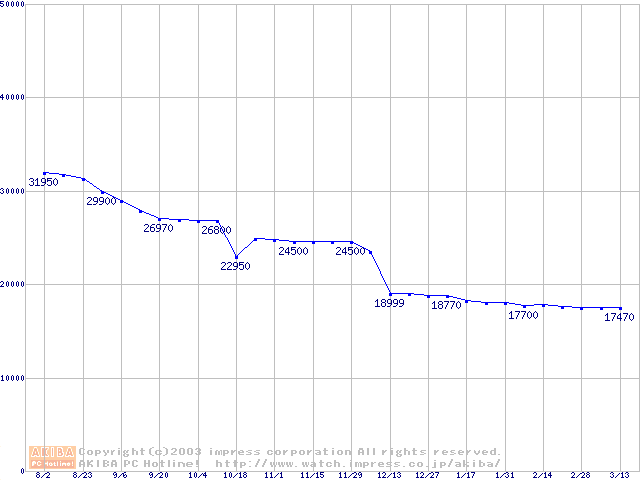 | [↑前グラフ]: | Travelstar C4K40 (1.8inch,4200rpm,UltraATA/100,FDB,20GB/Platter)の最安値推移 |
