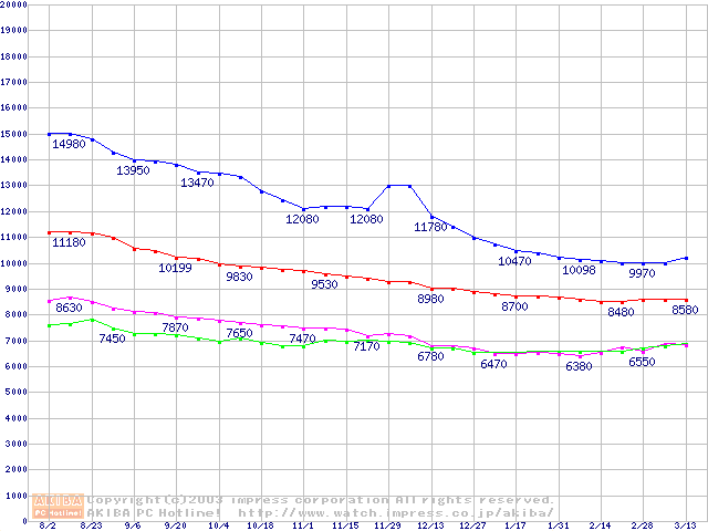 | [↓次グラフ]: | DiamondMax Plus 8 (7200rpm,2MB,UltraATA/133,FDB)の最安値推移 |