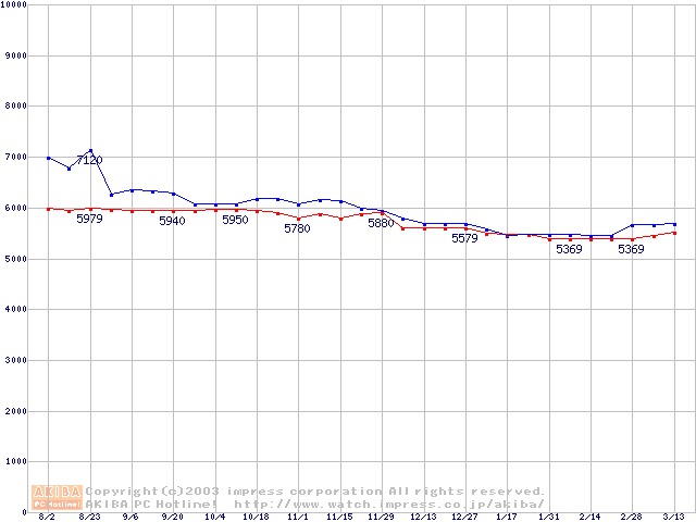 | [↓次グラフ]: | MaXLine II (5400rpm,UltraATA/133,2MB,80GB/Platter,BB)の最安値推移 |