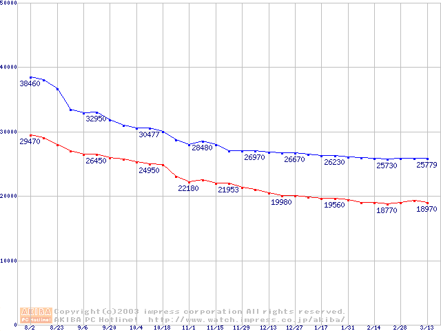 | [↑前グラフ]: | DiamondMax Plus 8 (7200rpm,2MB,UltraATA/133,FDB)の最安値推移 |