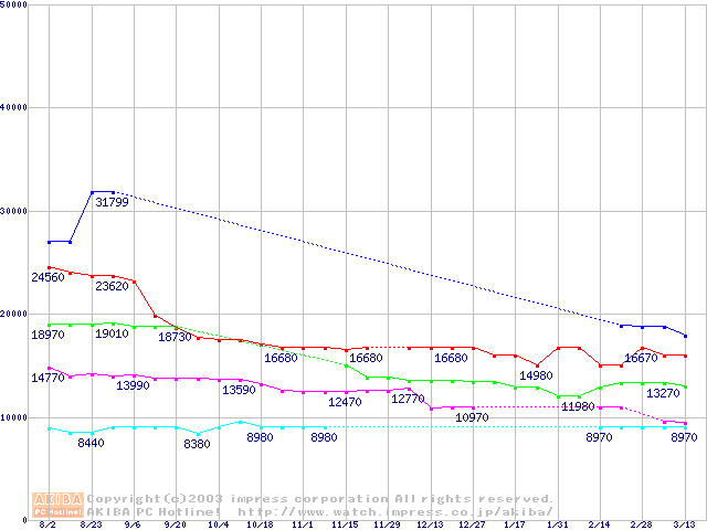 | [↓次グラフ]: | WD Caviar (7200rpm,UltraATA/100,20GB/Platter)の最安値推移 |