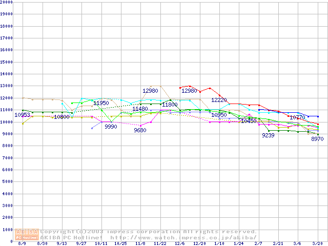| [↑前グラフ]: | 2.5インチHDD主要製品(最安値2万円~3万円未満)の最安値推移 |