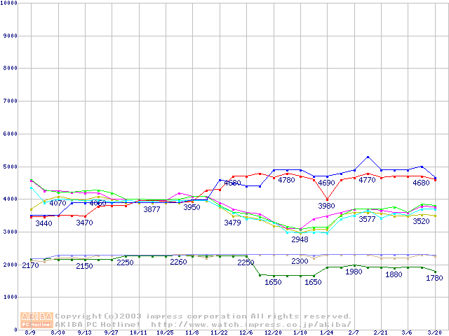 メモリ主要製品(最安値5千円~1万円未満)の最安値推移