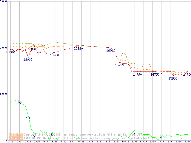 Socket 478 (micro-PGA,FSB 400MHz,L2 512KB,Northwood)の最安値推移