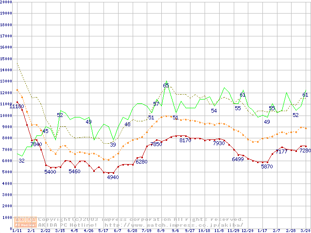 PC2700(DDR333) DDR SDRAM DIMMの最安値推移