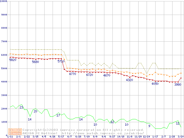 Socket 370 (FC-PGA2,FSB 100MHz,L2 256KB,Tualatin)の最安値推移