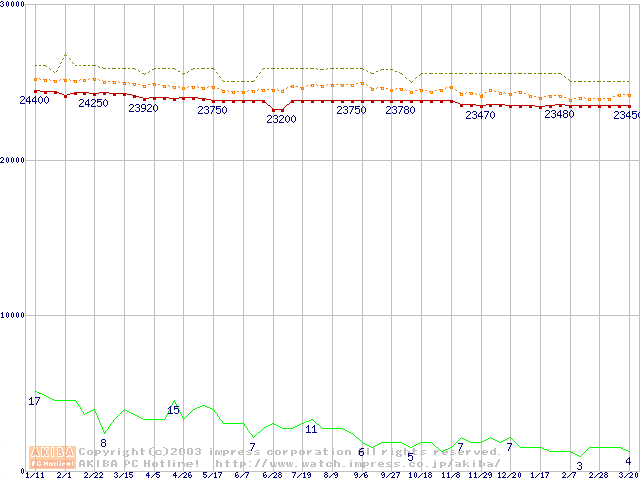 Socket 370 (FC-PGA2,FSB 133MHz,L2 512KB,Tualatin)の最安値推移