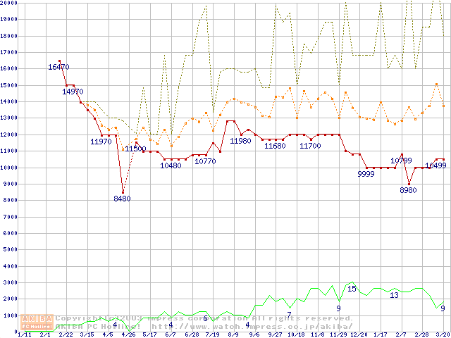 PC2700(DDR333) DDR SDRAM DIMM ECC対応 Registeredタイプの最安値推移