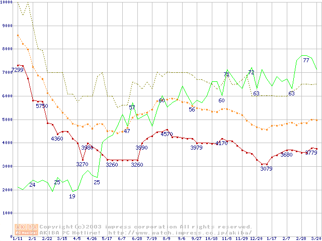 PC3200(DDR400) DDR SDRAM DIMMの最安値推移