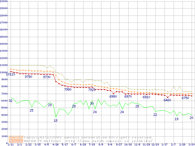 Socket 478 (micro-PGA,FSB 400MHz,L2 128KB,Northwood)の最安値推移