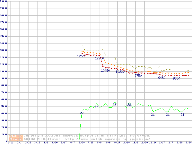 Socket 478 (micro-PGA,FSB 400MHz,L2 128KB,Northwood)の最安値推移