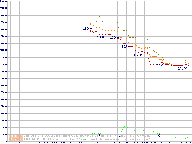HDD主要製品(最安値1万円~1万5千円未満)の最安値推移